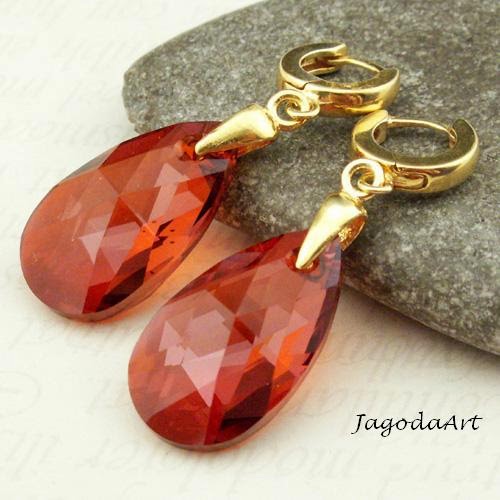 Ciąg dalszy Biżuteryjnego Rozgrzewania :-) Tym razem kryształy Swarovskiego w oszałamiającym odcieniu Red Magma, który w zależności od ilości światła mieni się różnymi odcieniami czerwieni. Jako fanka tego koloru nie mogę sobie odmówić i jak tylko mam okazję to zamawiam jakieś kryształki w tym odcieniu. A potem komponuję kolczyki- sama radość :-))
